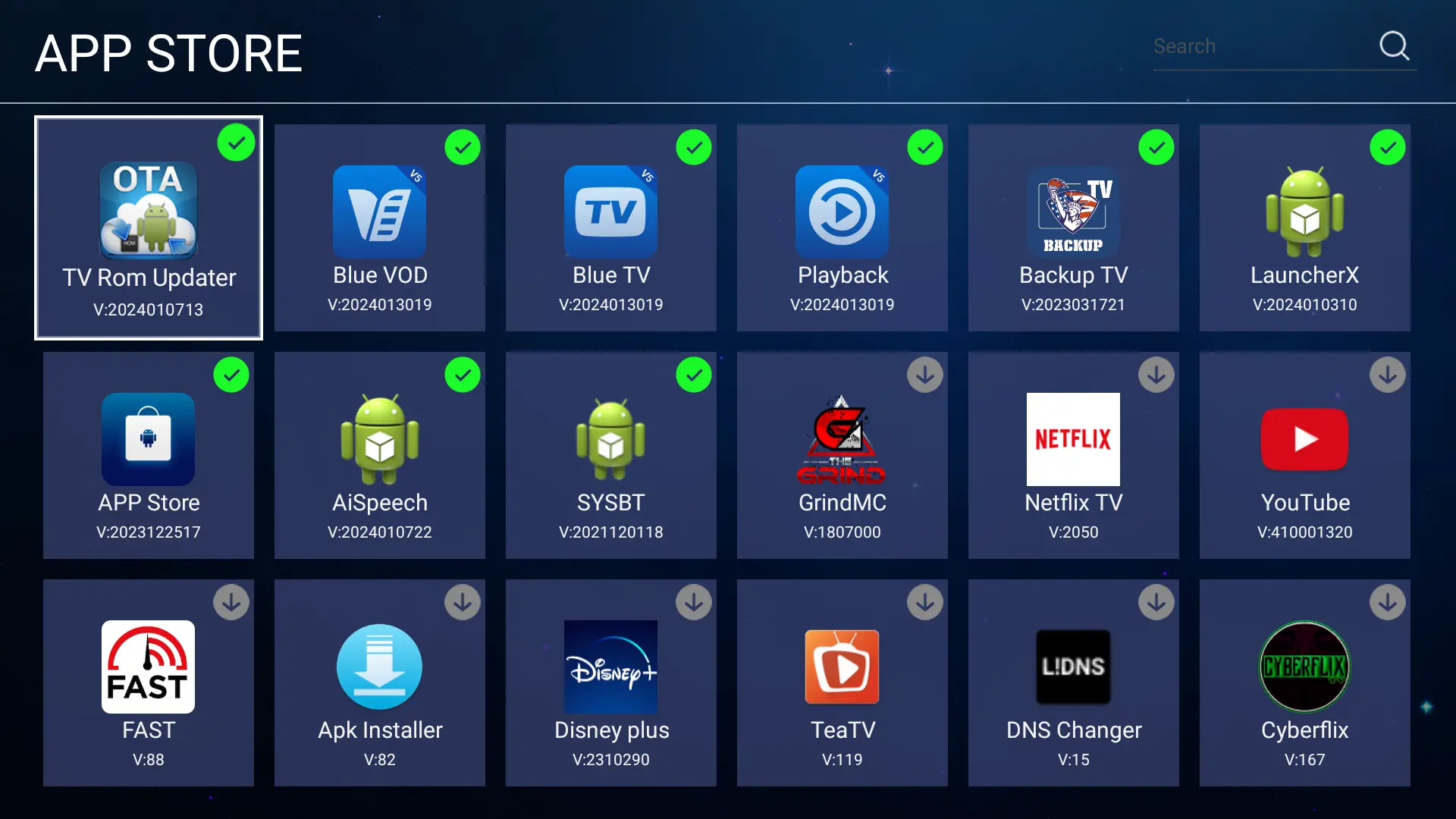 It may take a few seconds for the App Store icon to show up. If it does not, reboot the SuperBox and try again. Please make sure the SuperBox is connected to the internet. If the App Store icon is still not showing, you can try updating the system firmware by clicking on Apps, and then selecting TV Rom Updater. This update may be needed after factory resetting the device. If the Appstore still does not show, you can manually install it here.